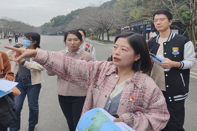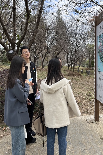 标识标牌是指有方向指引、讲解提示、文化传达等功能的牌子,承载着丰富的内涵,为人们的生活提供方便。中国在面向现代化、国际化发展的过程中,需要不断加强英文的普及使用,优化城市国际语言环境和营商环境,完善城市服务功能,展现城市高水平对外开放新形象。下午2点,全体成员来到景区,分成4个小组,对景区内外区域的标识牌、指示牌等外语标识进行及时拍照和规范性检查,充分发挥外语专业的优势,认真细致地为每一处外语标识标牌“找茬”,精雕细“啄”,学思践悟,推动以“啄”促改,以知促行,活动现场气氛活跃,党员们积极提出问题并进行相互交流。