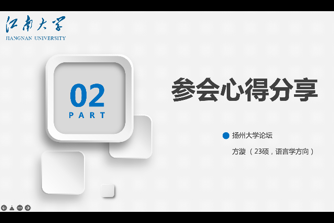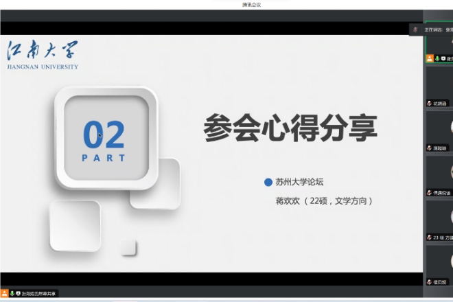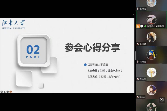 接着,三位参加论坛的同学代表轮流为大家介绍了参加各自论坛的经验与收获。袁安雪同学首先简要介绍了其参加的研究生学术论坛,并分享参会流程。她提到,参会人员要准备好PPT,内容详略得当,重在研究方法、过程、结论等,同时要注意语速适中,把控好时间。随后,袁同学教大家如何选择符合条件的会议,建议同学们根据自己的研究方向进一步去挑选合适的会议参加。侯贝妮同学则从前期准备、学术建议、公众号推荐和心理建设几方面进行分享,她向同学们提供了极具建设性的建议,包括:选题至关重要;摘要、开头结尾很关键;要有问题意识,论文体现解决问题的过程;大小标题都要仔细拟定;增强对理论术语的使用会使论文学术性更强,产生陌生化效应等。方漩同学就其参加扬州大学论坛的经历进行心得分享,从参加论坛前、参加论坛和参加论坛后三方面阐述心得。她分享道:PPT展示要讲重点,一些模糊的地方PPT里也要涉及到。除此之外,她还提醒同学们,论文的研究意义非常重要,从题目就能猜到结论的论文质量不高。蒋欢欢同学的分享分为两大部分,一是其论文写作的大致情况,二是其个人的参会经历。她重点强调了会议投稿时和参加会议时PPT制作的重要性,同时,发言文稿也要经过整理和删减,切忌整篇论文复制上去现场念稿。最后,蒋同学围绕听、学、记、思四方面总结参会过程,并分享参加论坛后自己获得的知识更新与认识深化。几位同学都充分认识到,参加学术会议不仅能通过主旨讲座和分论坛交流拓展学术视野,而且能结识到有共同研究兴趣的伙伴们,更为重要的是,自己形成了很多新的思考。