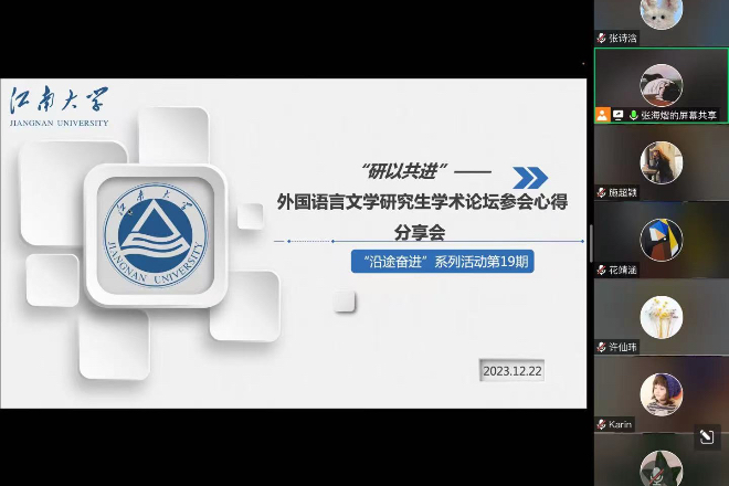 2023年12月22日19点,伟德国际1946“研途奋进”第十九期活动在腾讯会议线上成功举行。学院全体硕士研究生参与了本次活动。此次活动的主题是“研以共进”外国语言文学研究生学术论坛参会心得分享会,共分为四个环节:谢竞贤副院长通报研三预答辩情况、江苏科技大学论坛参会学生心得分享、扬州大学论坛参会学生心得分享和苏州大学论坛参会学生心得分享。