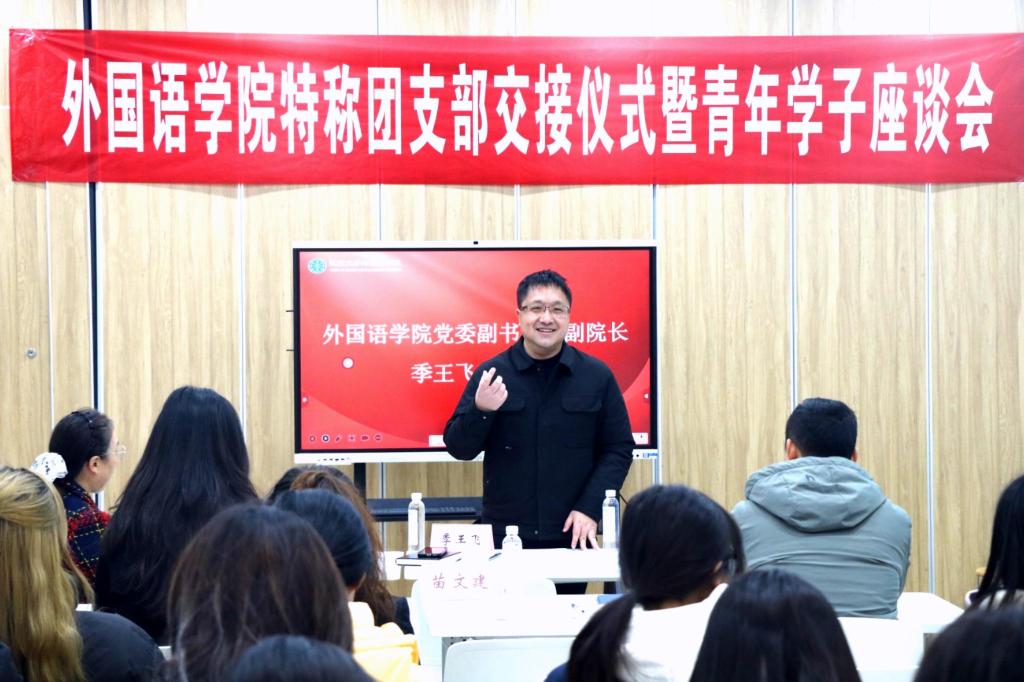 季王飞总结发言,他回顾了张闻天同志的革命精神,强调新时代青年应传承并发扬这一精神,以张闻天精神为思想引领旗帜,推动学院团支部建设进一步发展。季书记表示,新时代的外院学子不仅要提升综合素质,发挥外语优势,让中国与世界同行,更应将个人理想与国家命运紧密相连,勇挑时代重担,开拓进取,为实现中华民族伟大复兴贡献青春智慧与力量。