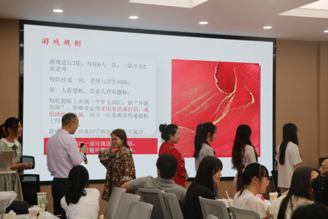 为增强活动的互动性与趣味性,研会精心设计了“学术传声筒”语言竞技游戏。参赛者需使用英语或日语结合肢体动作,依次传递题板内容,既考验语言表达,也锻炼团队配合。比赛过程中笑声不断,精彩纷呈。最终获胜小组获得特制颜料奖励,用于后续的漆扇创作,极大地激发了同学们的参与热情与创作灵感。