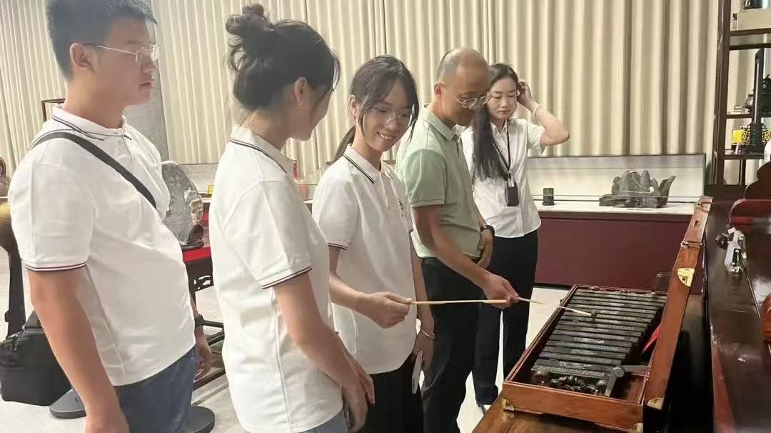 当日下午,师生们赴灵璧县文化和旅游局参与文旅座谈,县文旅局党组成员李栋着重介绍了灵璧县在非物质文化遗产保护等方面取得的成果,虞姬文化园负责人凌娟、灵璧县博物馆负责人温馨、奇石园负责人位丽丽分别介绍了当地文化景点的历史背景、特色亮点与发展规划。方文开提出以酒文化推广、品牌国际化、文创产品研发等为突破口,与灵璧文旅资源进行有机融合,为文旅品牌注入高校创新力量。同时,双方一致表示将拓展学生社会实践与创新创业平台,实现双向赋能,合作共赢。座谈结束后,师生还走进灵璧县博物馆,通过讲解深入了解“灵璧三宝”——灵璧奇石、虞姬文化和钟馗画的文化内涵。