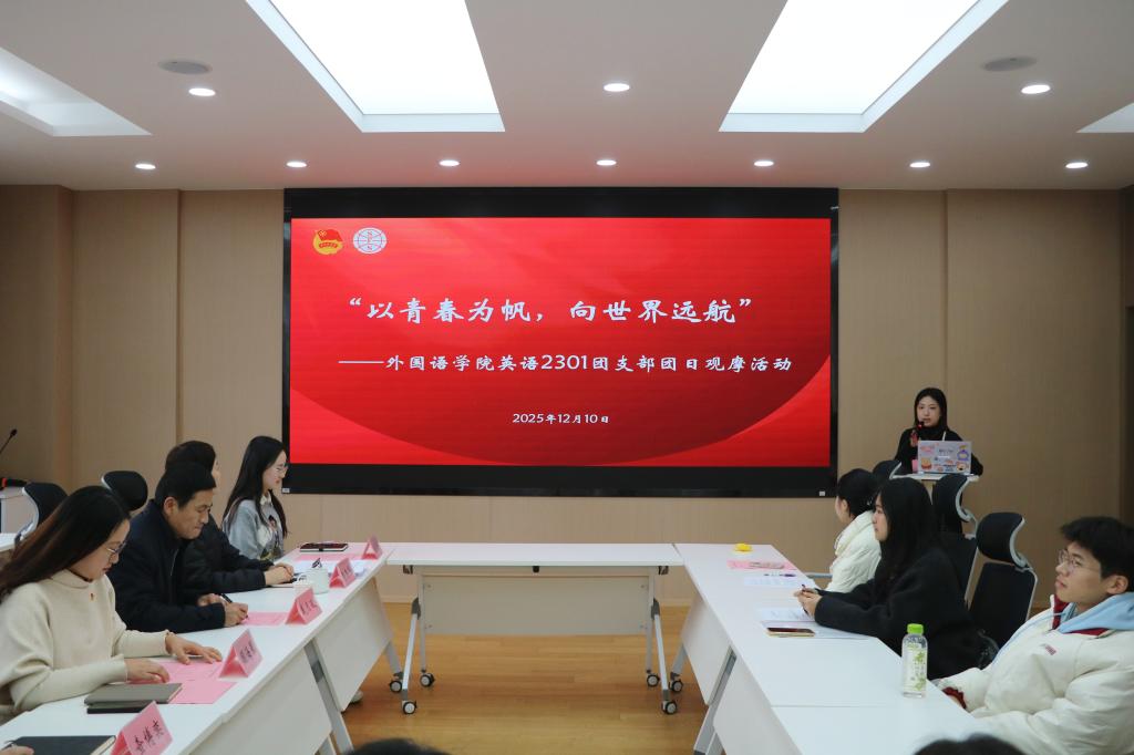为深入学习贯彻党的二十届四中全会精神,紧扣“十五五”规划开局背景与新时代高水平对外开放的发展要求,通过示范引领推动团支部建设提质增效,12月10日下午,伟德国际1946英语2301团支部在伟德国际1946A349举办“以青春为帆,向世界远航——外语学子在‘十五五’征程中的使命与担当”主题团课观摩活动。校党委常委、副校长戴月波,院党委书记李荣华,分团委书记顾海星等师生代表出席本次活动,各年级班团骨干参加了观摩学习。活动由英语2301团支书朱彤主持。