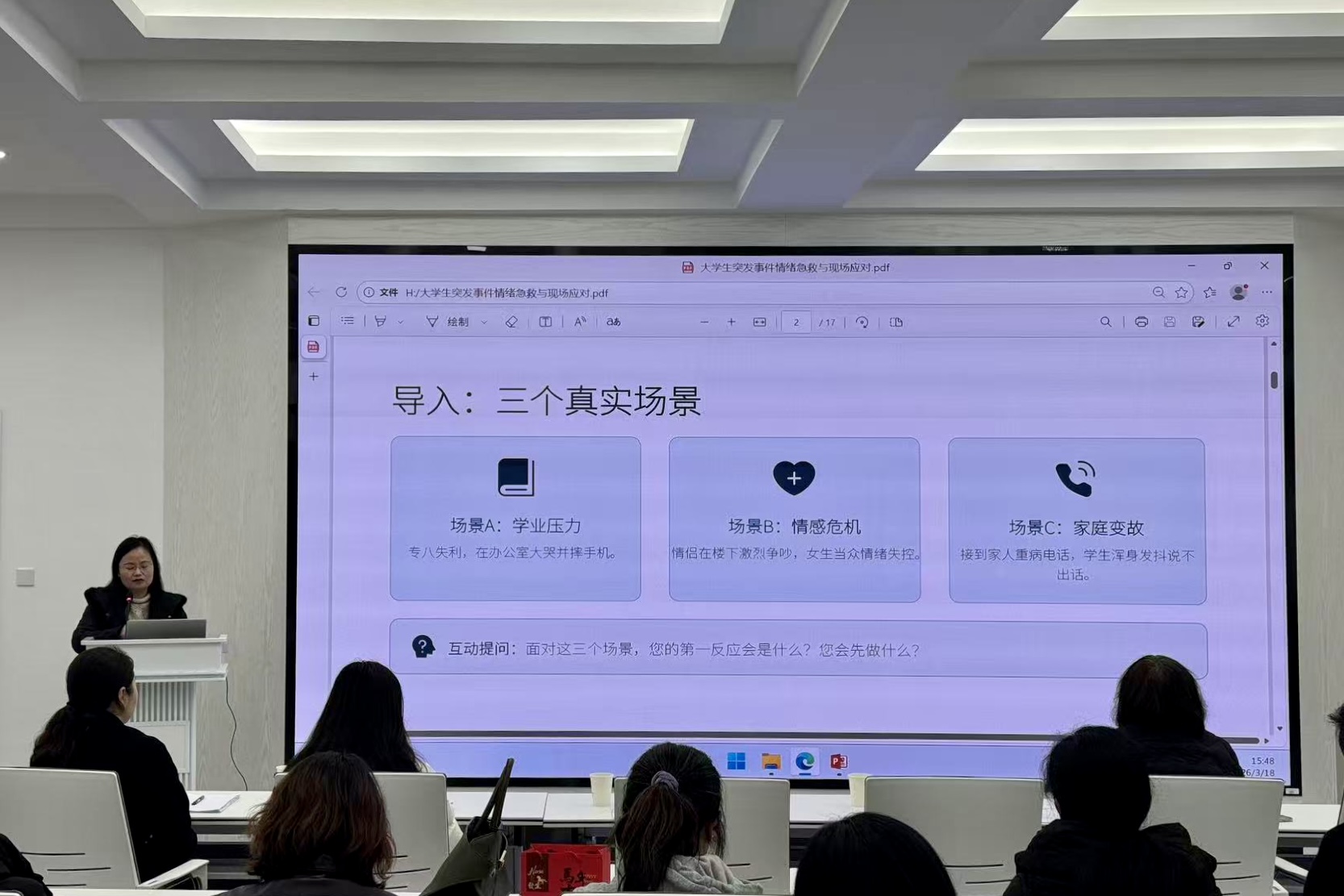 本次会议特别邀请董霞作《大学生突发事件情绪急救与现场应对》专题讲座。董霞立足一线学生工作丰富实践经验,以典型案例为切入点,深入浅出讲解了大学生心理危机、突发事件的识别技巧、现场情绪安抚沟通方法及后续规范处置流程,为班主任应对各类突发情况提供了实操性指导。