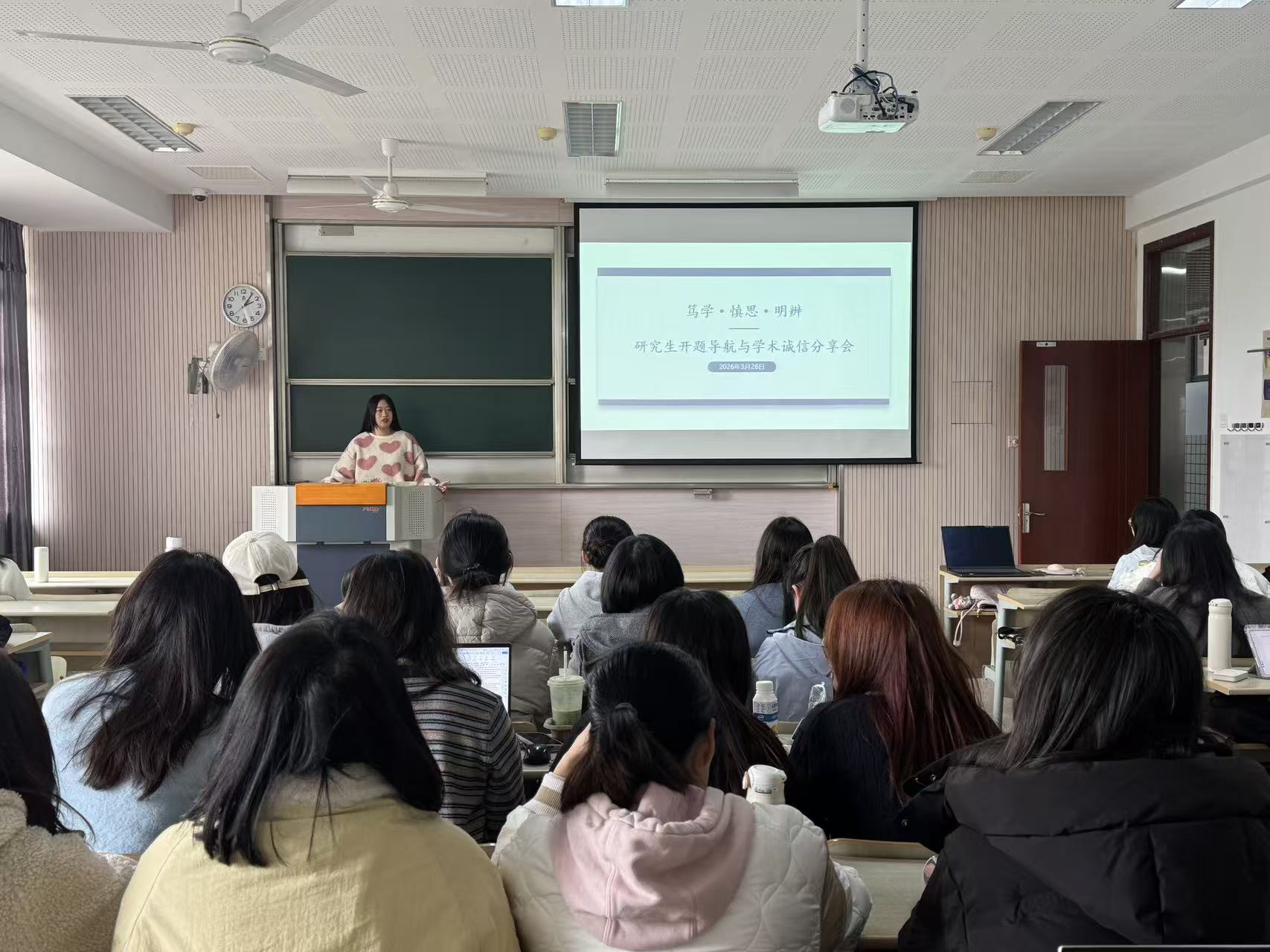 2026年3月26日下午,伟德国际1946“研途奋进”第31期活动在第二教学楼2A407教室顺利举行。本次活动以“笃学·慎思·明辨——研究生开题导航与学术诚信分享会”为主题,面向2025级硕士研究生及部分研二学生,旨在帮助同学们从容应对硕士论文开题答辩,筑牢学术诚信意识。