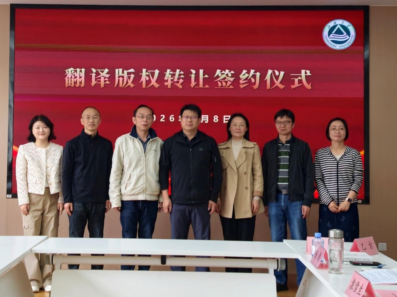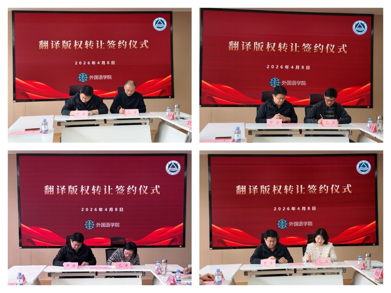 随后,签约仪式正式举行。双方代表依次签署翻译版权转让协议。签约完成后,方文开院长作总结发言。他再次感谢王建华处长的支持,明确了学院后续工作方向:一是对标标杆院校,推进区域国别研究二级硕士点建设;二是打造AI赋能的翻译交叉平台及科研平台;三是聚焦轻工、食品等特色学科,做大做强译著品牌。