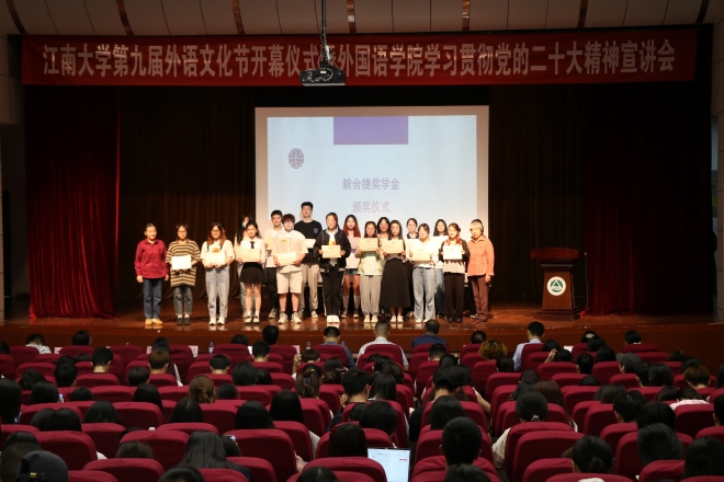 4月19日下午,伟德国际victor1946第九届外语文化节开幕式暨伟德国际1946学习贯彻党的二十大精神宣讲会在南区大学生活动中心如期举行。伟德国际1946党委书记李荣华、校党委学生工作部副部长俞立峰、校团委副书记杨飏、学院党委副书记刘伯贤、“振初琴华奖学金”捐赠代表陈志钢、学院英语系主任孙志祥、日语系主任张鹏、学院关工委常务副主任鲍国庆、关工委委员吴艳敏、学院分团委书记陆芳及辅导员、班主任老师出席本次活动,相关学院学生代表以及我院500余名学生参会。
